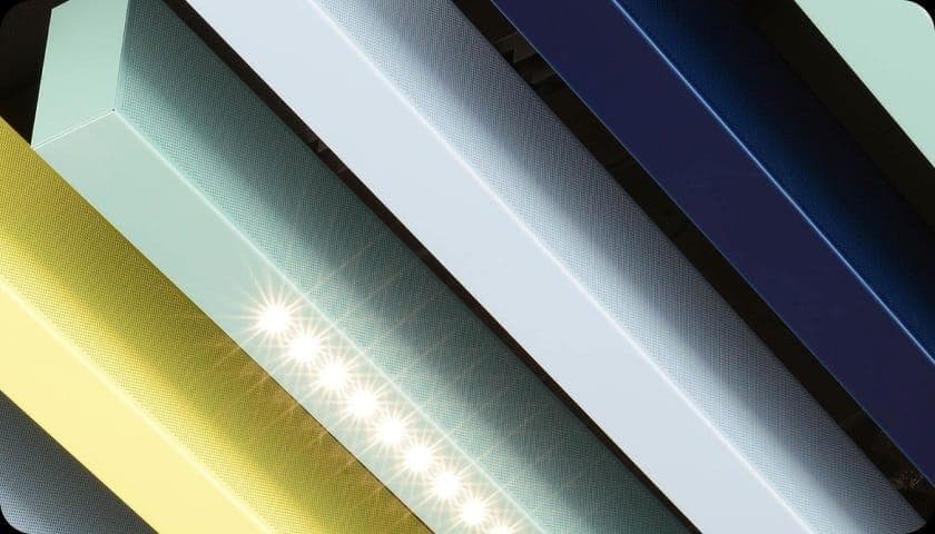 Great for bespoke design with an extensive range of colours and finishes including baffle and mesh ceilings