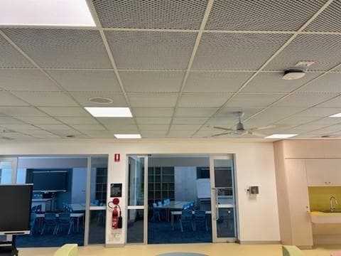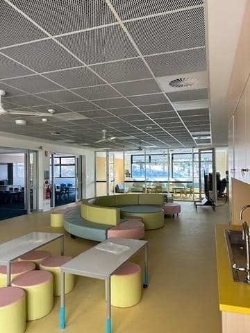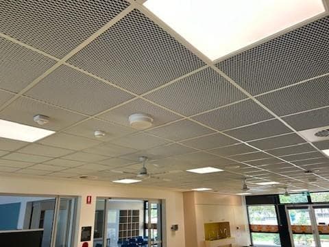 As part of this transformation, durlum mesh panels were installed to create a visually striking decorative ceiling between classrooms. These panels were paired with OWA Sinfonia Black infill panels, delivering a clean and cohesive aesthetic. The durlum S3 framing system ensured the ceiling remained fully accessible, allowing easy access to essential services above.
