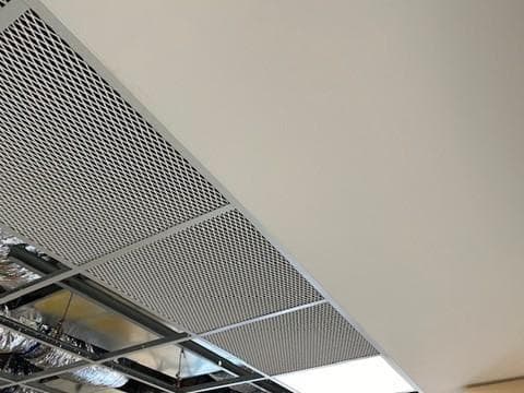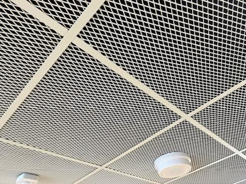 durlum S3 M110 aluminium mesh panels - 1.5mm BMT - White RAL9003 PPC with OWA Sinfonia Black backing panels for acoustic value.