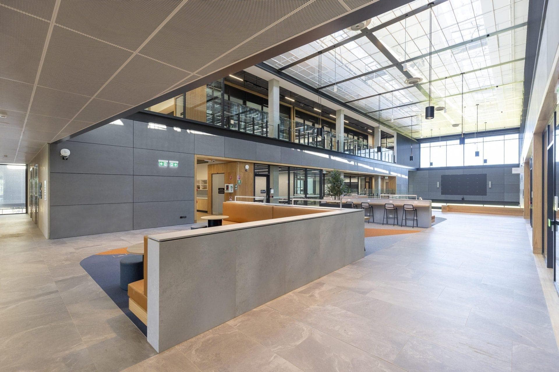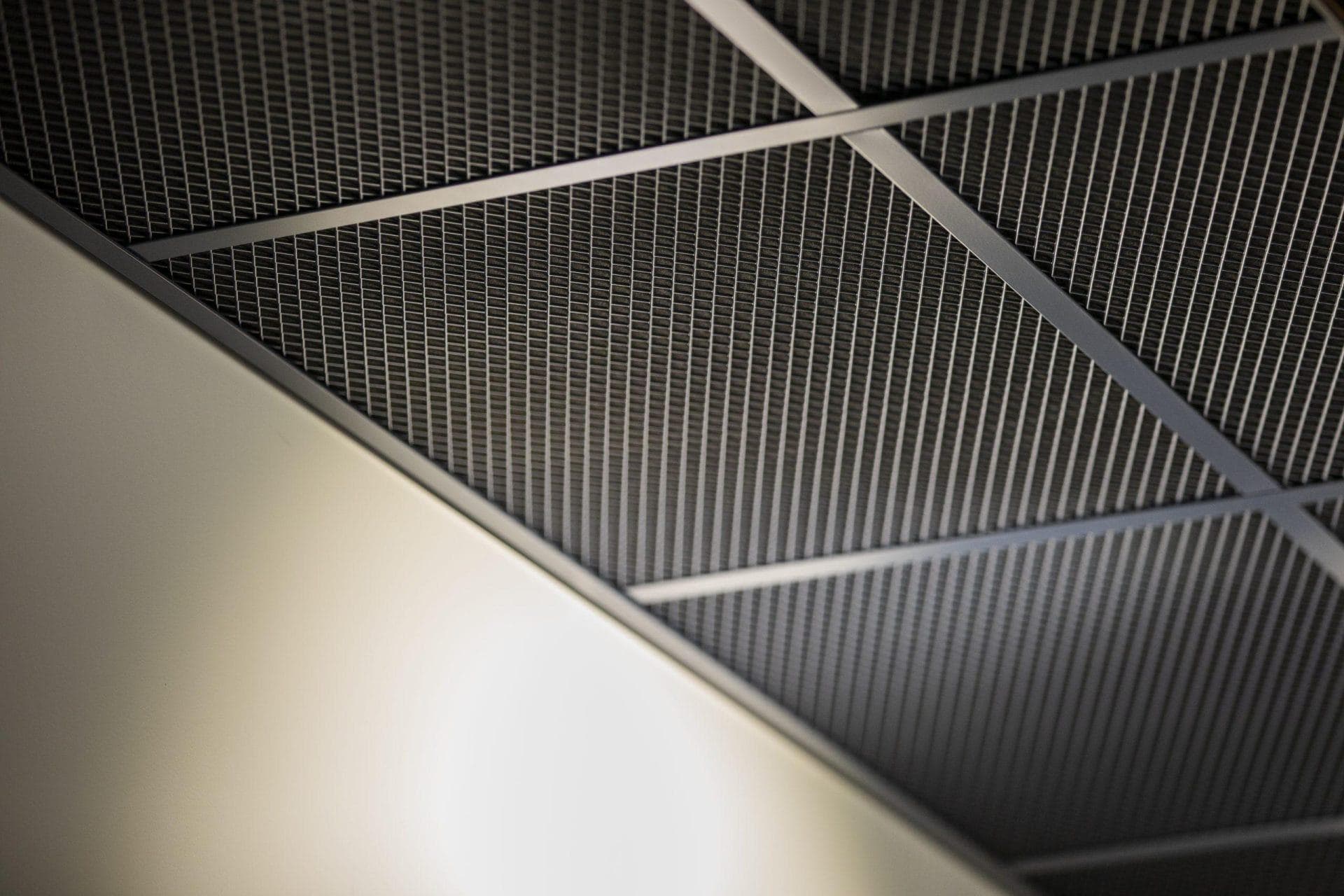 Dunrite Linings installed expanded metal mesh panels from durlum throughout the facility. Black, Blue and Grey expanded metal mesh were used in classrooms and meeting rooms to create intimate, focused spaces, while lighter grey tones were selected for public areas to enhance openness. For the corridors, durlum S1 Clip-In tiles were installed to achieve precise, linear ceilings in lower-height spaces.