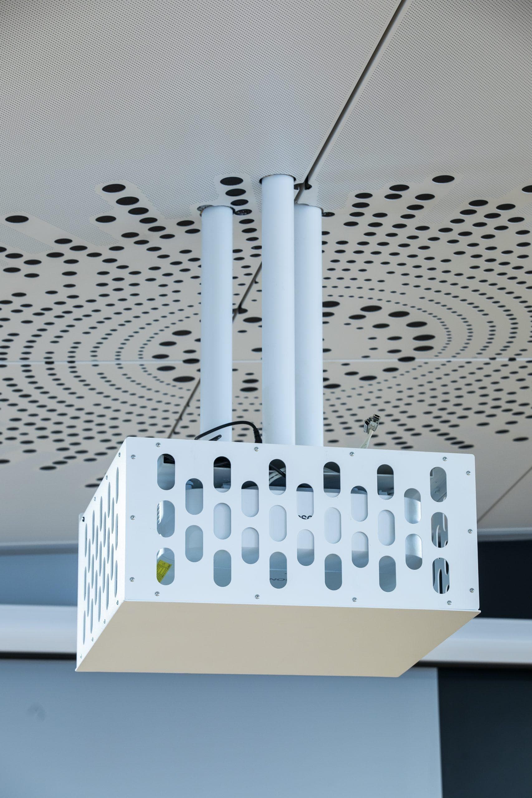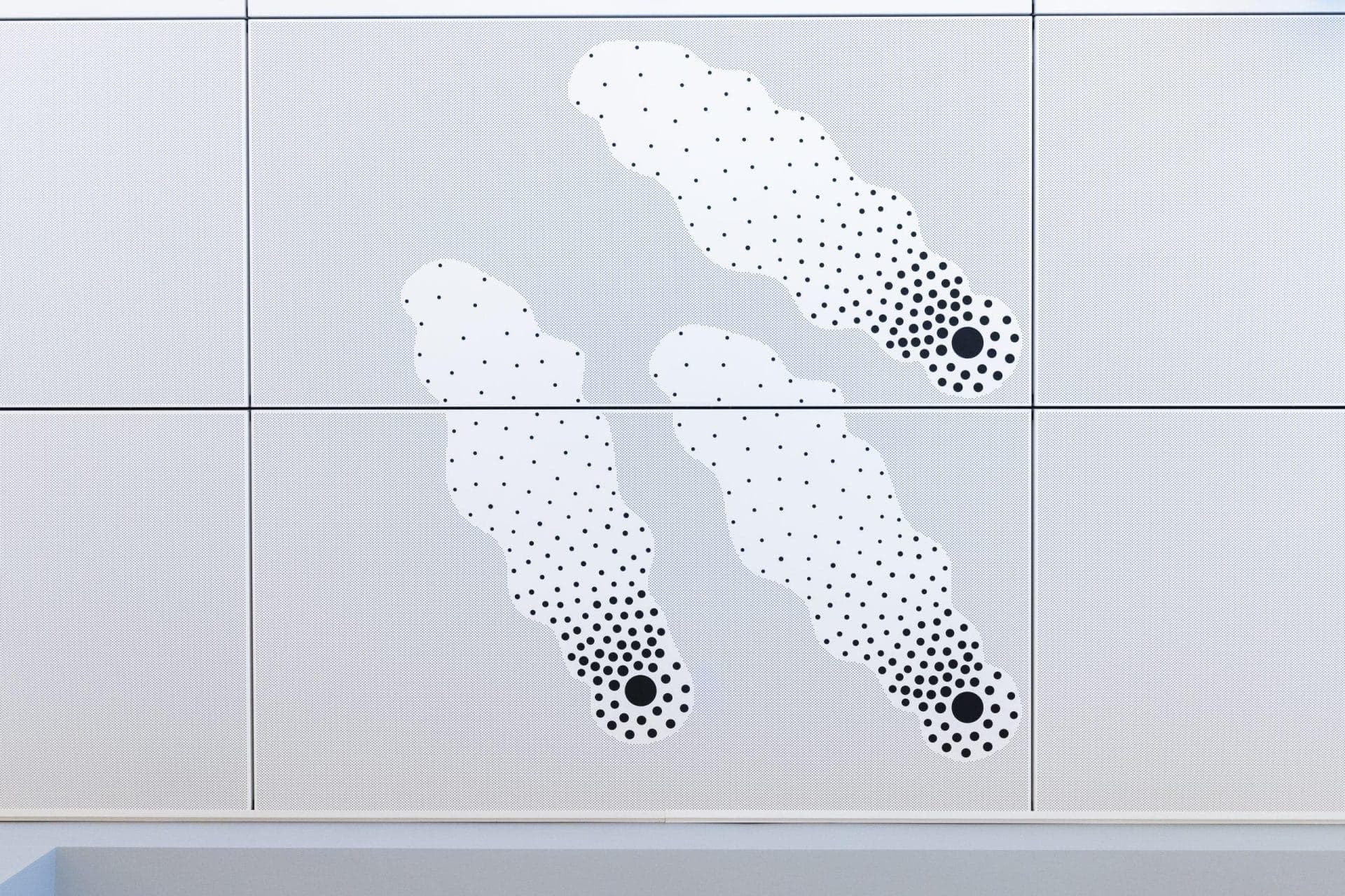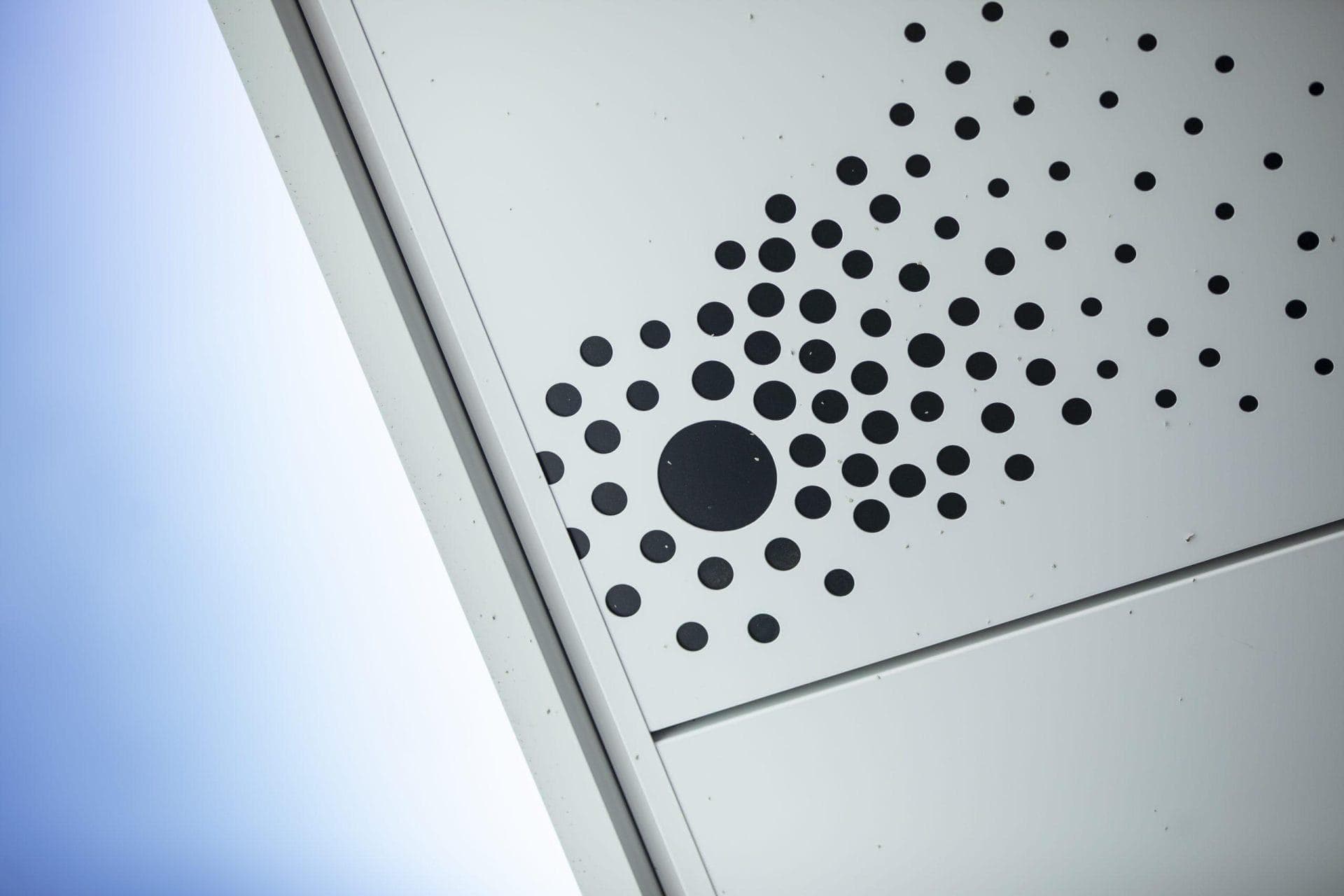 To meet the design brief, Network Architectural supplied a custom perforated durlum S7 ceiling system, finished in White RAL9003 and fabricated in various panel dimensions. Installed using the S7 Double Hook-On system with storm brackets, the ceiling spans over 400m², continuing from the interior of the hall to the external soffit that wraps the perimeter of the building.