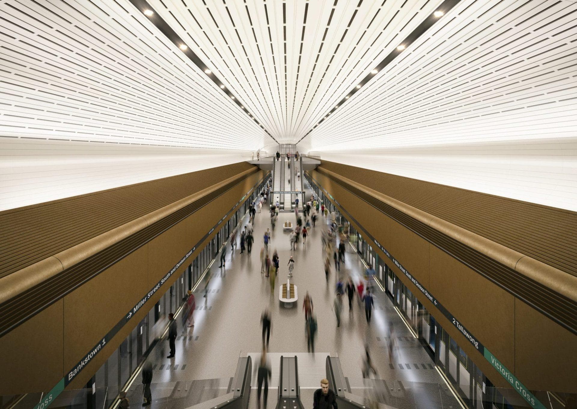 Sydney Metro’s Victoria Cross Station is an underground station, about 31 metres below ground level. It is located in the heart of the North Sydney business district and has access points at both its northern and southern end and an island platform at the core. Along with a 42-storey office building, the development includes public plazas and retail spaces, to accommodate the growing urban density of the area. It will deliver a public legacy that transforms North Sydney, integrating place, metro and office building into a holistic shared precinct for the future.